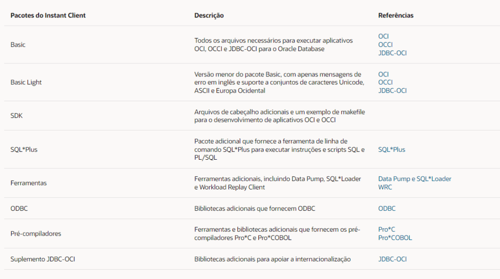 Client Oracle – é um pacote mais completo e robusto para conexão e administração de um banco de dados, ali contem utilitários para cargas, extração de dados entre outros utilitários para tratar dados ou functions que estarão no seu banco de dados.